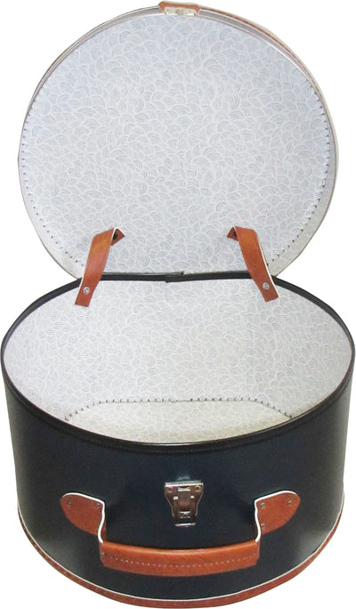 Denna hattask är i ett klassiskt svart utförande och orginal storlek med rejält utrymme inuti för dina favorithattar. Tillverkad i hållbar formstabil kartong med kant och handtag av konstläder och metallbeslag.